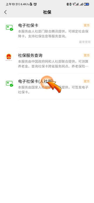 5、在社保页面中点击最底部的“电子社保卡(人社部)”选项。