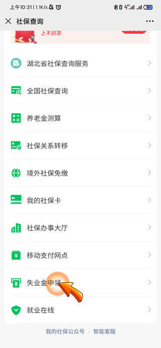 7、将页面滑到底部,点击“失业金申领”选项