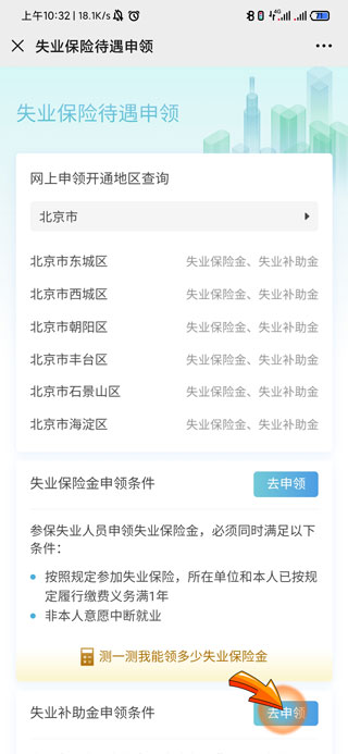 9、最后点击最底部的失业补助金申领条件右侧的“去申领”,填写相关信息办理申领手续。