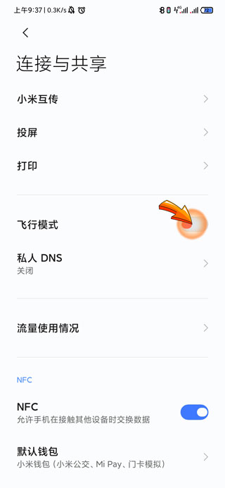 3、此时页面中会出现飞行模式文字,点击打开右侧的“开关”按钮。