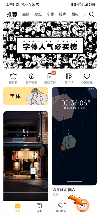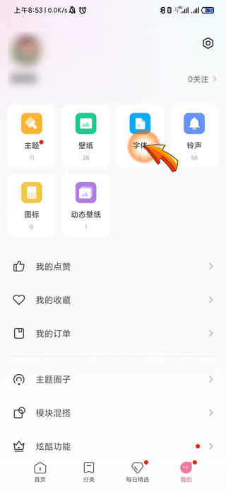 3、在我的页面上方有一个“字体”图标,点击进入。