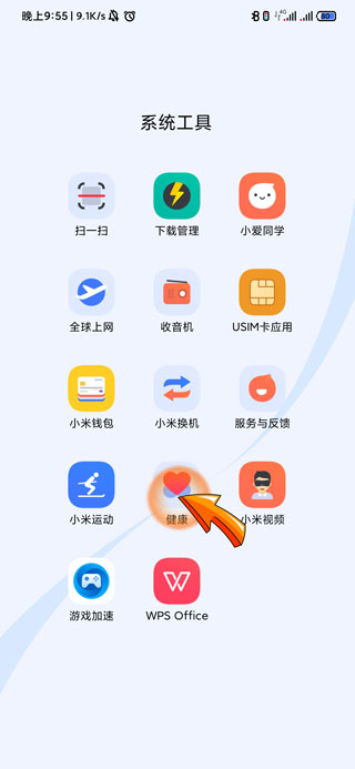 1、查看小米手机睡眠监测需要在桌面上找到并点击“健康”图标。