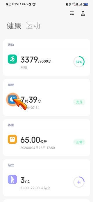 小米手机睡眠监测查看需要打开桌面中的“健康”图标,进入后点击睡眠文字下方的“月亮”图标,此时出现的页面即为睡眠监测情况,其中记录了睡眠时的深睡、浅睡、清醒时间等数据。