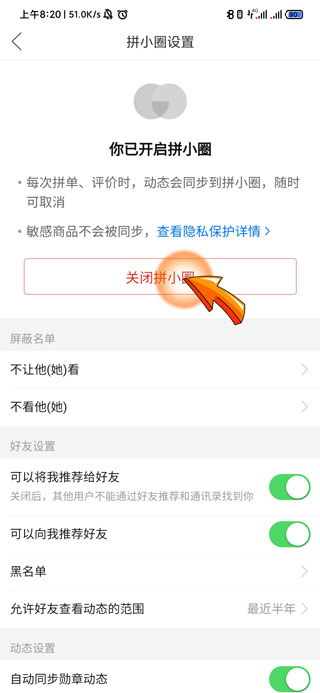 4、此时页面显示你已开启拼小圈,点击“关闭拼小圈”后别人就看不到自己买了什么了。