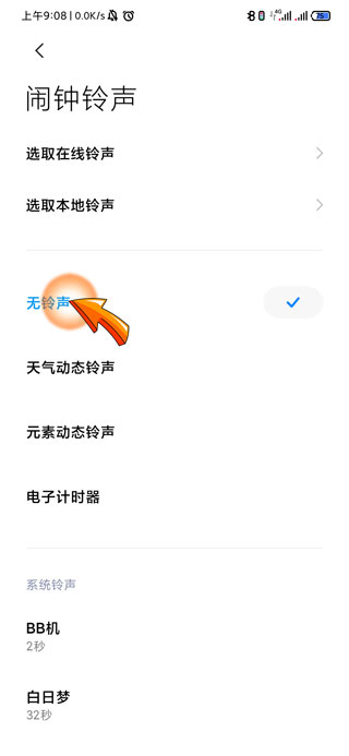 5、进入铃声设置后,点击选择“无铃声”选项,手机闹钟就没有声音了。
