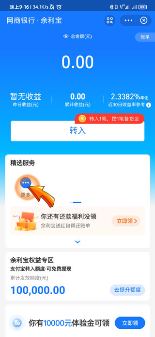 3、进入余利宝后,将手指放置“精选服务”区域的空白地方,然后向左滑动。