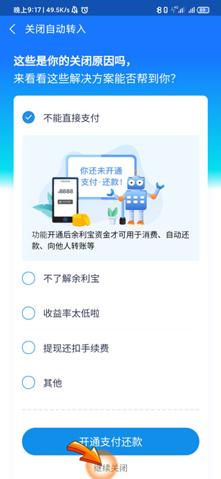 7、最后点击“继续关闭”后余利宝的自动转入功能就关闭了。