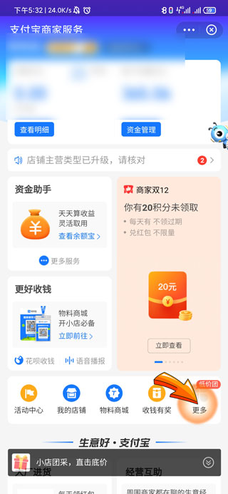支付宝二维码开通花呗收款需要打开支付宝APP,点击右下角“我的”图标,然后点击“商家服务”选项,再点击右下方的“更多”图标,进入页面后找到并点击“花呗收钱”选项,最后点击“开通花呗收款”即可。