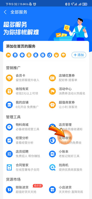 4、之后在页面中找到并点击“花呗收钱”选项。