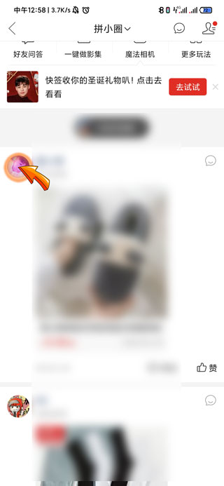2、进入拼小圈页面中会显示好的的动态信息,然后点击想要删除的好友的头像,即可进入好友主页。