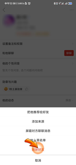 4、最后在页面框中选择并点击“删除好友”选项,好友就已经删除成功了。