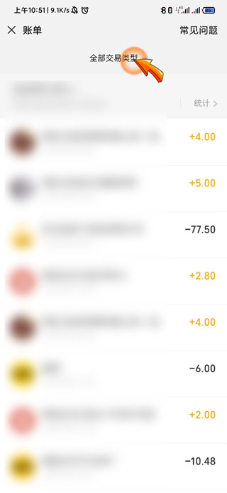 5、再点击账单上部的“全部交易类型”选项,此时页面下方会弹出窗口。