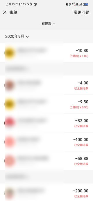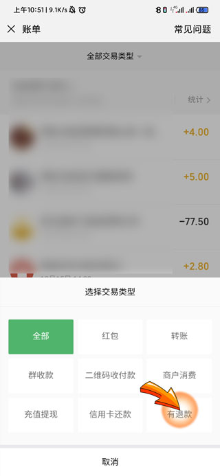 6、在弹出窗口中点击“有退款”选项,就可以查看最近退款账单。