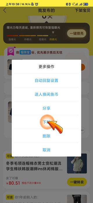4、最后在弹出的页面中点击“下架”选项,闲鱼商品就可以达到已卖出的效果了。