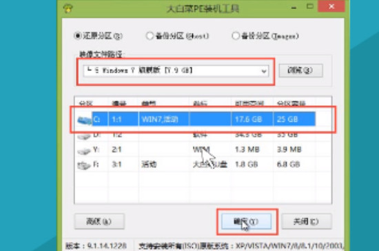 选择u盘启动,然后进入大白菜模拟系统中,选择C盘,点击“确定”。