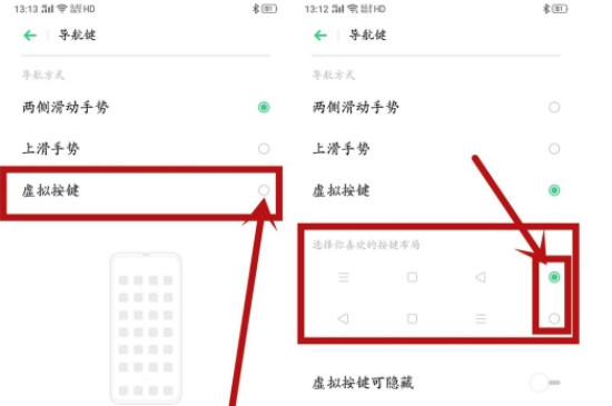 3、进入导航键界面后,选择界面中的“虚拟按键”选项,之后根据个人的习惯调整三键的布局,布局调整完成后,屏幕下方就会出现三个虚拟按键。