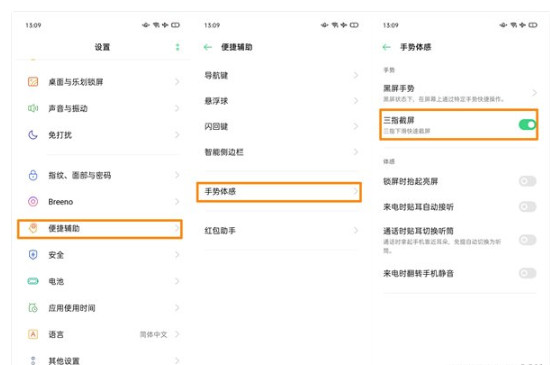 点击手机桌面中的“设置”选项后依次点击“便捷辅助”、“手势体感”、“三指截屏”,之后三指上下划动屏幕也可以进行截屏。