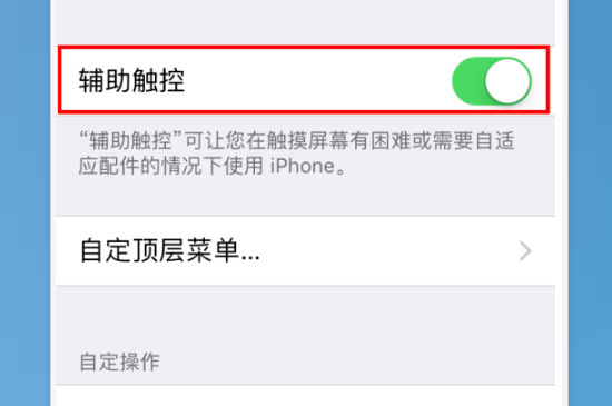 4、在辅助触控中点击右侧的开关按钮,打开后就能看到屏幕上的悬浮球了。点击自定顶层菜单,可以对默认的菜单进行自定义设置,方便使用。