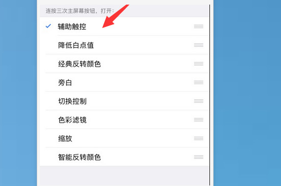 4、在辅助功能快捷键页面勾选辅助触控选项,根据页面提示,连续按3次苹果8p手机的home键,手机屏幕上就会出现小圆点。