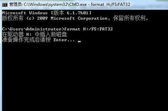 2、弹出DOS窗口后,在栏目内输入 “format H:/fs:fat32”指令,若u盘对应J盘或F盘,则要将format H:/fs:fat32中的H改为J或F。