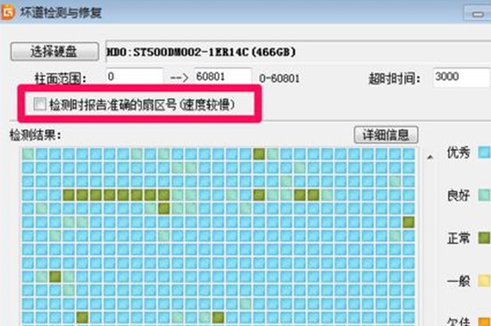 2、点击“开始检测”,在检测完毕后,软件会显示所有检测到的坏道区域数。之后点击软件界面下方的“尝试修复”,按照提示做好备份后,再点击“确定”,直到原坏道区域由红色变为正常颜色后,机械硬盘也就修复完成了。