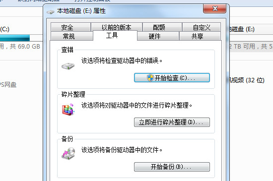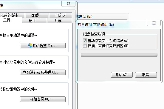 2、进入可移动磁盘属性界面后,点击界面中的“工具”栏目,再点击下方的“开始检查”选项。弹出磁盘修复框后,再勾选两个选项栏。