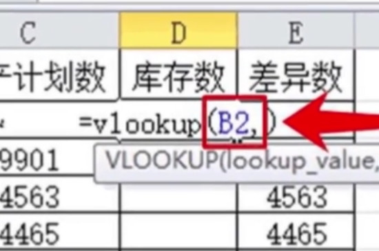 1、对比两个表格的数据,在库存数一列中输入公式vlookup,第一个参数选取为B2。