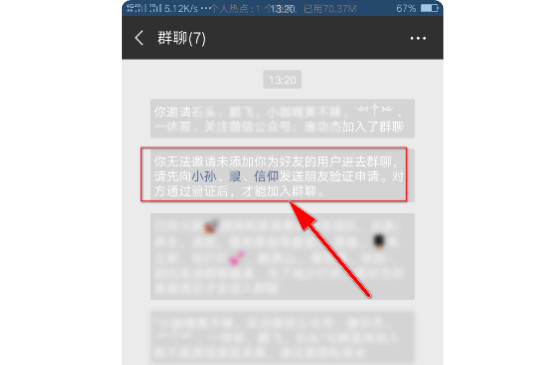 3、进入群聊之后,微信会在屏幕上给你提示,若是对方已将你删除,提示的是你和对方并不是好友,需要发送好友验证。