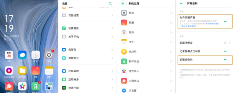 首先在手机设置里打开“系统应用',点击"屏幕录制”,然后开启“允许录制声音”和“前置摄像头”。