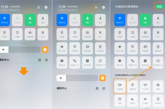 打开手机,从屏幕顶端下滑,打开菜单栏。找到“开始录制”,点击即可开始录屏。如果没有,点击右上角设置图标旁左边的图标,将下方的屏幕录制按钮拖动上去就可以了。