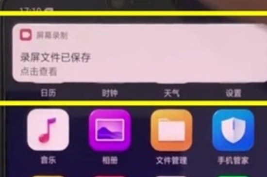 录制好后,点击红色方点的图标就可结束录制。然后屏幕上方会出现“屏幕文件已保存”点击后就查看刚刚录制的视频。或者在手机相册里可以查看。