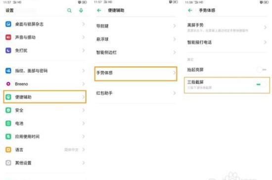 打开手机设置,找到“便捷辅助”,点击进入后点击“手势体感”,开启“三指截屏”就可以用三指下滑进行截屏了。