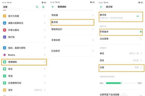 打开手机设置,点击“便捷辅助”,然后点击“悬浮球”,开启“悬浮球按钮”选择“手势操作”,就可选择单击、双击或长按悬浮球手势进行截屏。