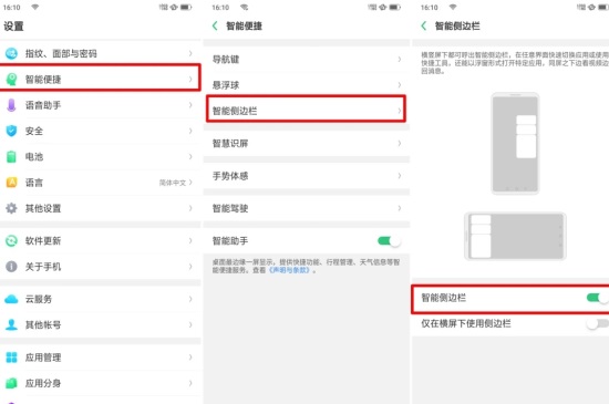 打开手机设置,点击“便捷辅助”,然后点击“智能侧边栏”,开启智能侧边栏后就可以从屏幕左侧或右侧向屏幕中心滑动,呼出智能侧边栏,在快捷工具里点击“截屏”来截屏了。
