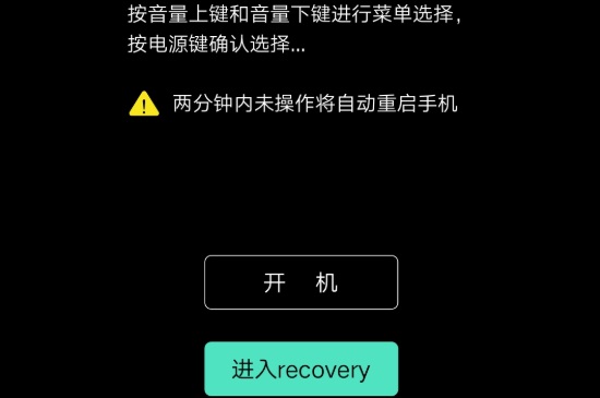 手机进入recovery模式,通过音量加减键操作屏幕,选择“进入recovery”按电源键确认。