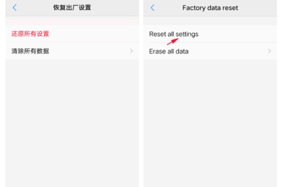 进入后可选择还原所有设置或清除所有设置。