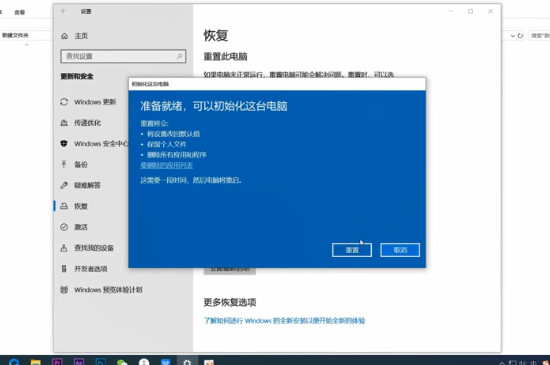 3、最后在弹出的窗口中选择“确定”,就可以将电脑恢复出厂设置。需要注意恢复出厂设置之后首次登录电脑的时间比较长,这个过程中不要将电脑关机或拔掉电源。