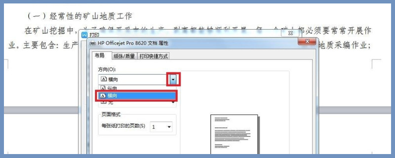 3、进入打印预览设置界面后,点击界面右上角的“属性”,之后点击“布局”并将方向改为“横向”,点击确定后,打印出来的文件就可以变横的。