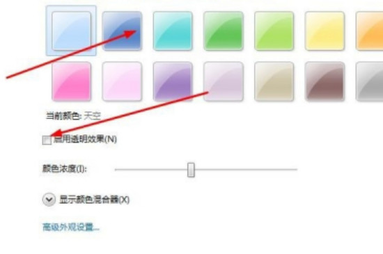 2、颜色选好后,再根据自己的需求调整“颜色浓度”,之后点击“高级外观设置”并选择界面“选项”栏内的“窗口”,最后依次点击“确定”、“保存修改”即可。