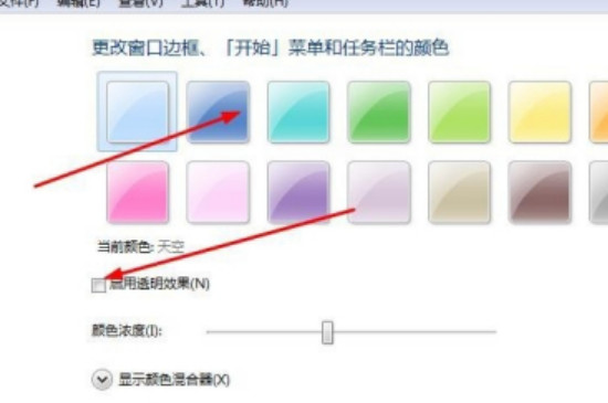 2、选择鼠标右键单击弹出选项栏内的“个性化”后,再根据自己的需求用鼠标左键单击选择页面中的任意颜色选项,选择完成后,再调整颜色的透明度。