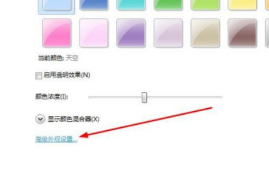 3、颜色的透明度调整完成后,再点击下方的“高级外观设置”,点击“项目”选项后选择窗后,之后点击“确定”,再点击“保存修改”,底部的显示栏颜色就恢复了。