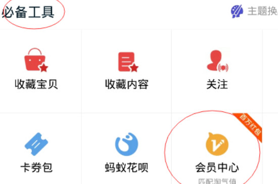 2、在淘宝个人中心界面内找到“必备工具”栏目下方的“会员中心”选项,再点击“会员中心”进入淘宝会员俱乐部,页面内会提示淘宝会员大升级。