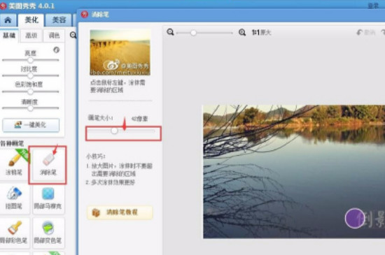 3、此外去除图片上的水印还可以使用美图秀秀,在电脑上安装好美图秀秀并将其打开后,将图片导入美图秀秀内,之后点击美化图片,找到消除笔后放在有水印的部位涂抹,水印也会消失。