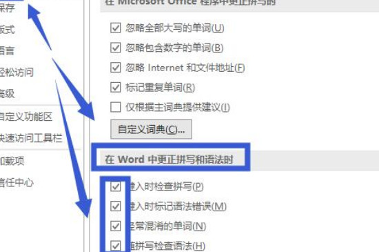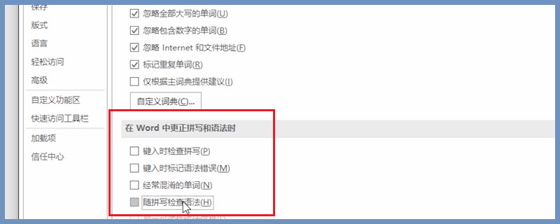 3、将栏目下方“键入时检查拼写、键入时标记语法错误、经常混淆的单词、随拼写检查语法、显示可读性统计信息”四个选项左侧的方框去掉勾后,word文档就不会再出现波浪线。