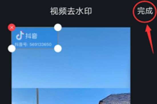 2、将需要去除水印的视频导入软件里面后,再移动屏幕调整视频上的矩形区域,让矩形完全覆盖有水印的部位后,再点击视频右上角的“完成”,软件就会自动进入去水印程序,水印完全被去除后,就可以保存在本地。