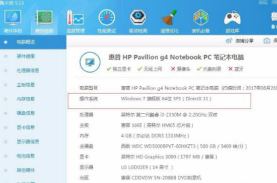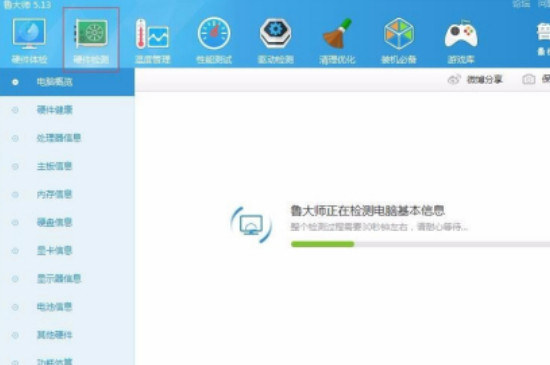 3、鲁大师内的硬件检测功能开启后,软件会自动检测电脑的硬件和软件信息,检测完成后,界面就会显示电脑所用的windows系统和其它硬件和软件信息。