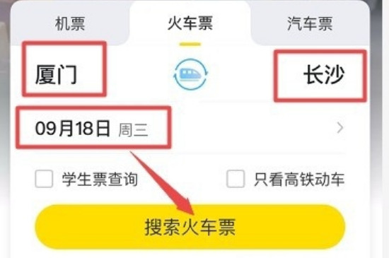 2、进入火车票搜索界面后,选择好出行的始发地和目的地,再选择好日期,之后点击下面的“开始搜索”选项。界面显示出所有的列车信息后,再选择适合自己的车次。