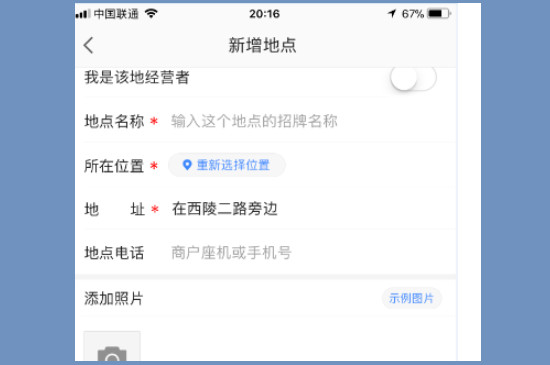 最后再次点击界面中的新增地点,这时就会需要输入地点名称、所在位置、电话等信息,填完后点击下方的提交。提交后大概需要2~3天进行审核,审核完毕后就可以在界面中我的店铺中进行查看。