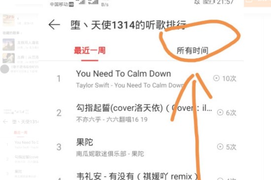 将最近一周改为所有时间选项,最后点击歌曲,就可以查看该歌曲的听歌次数了。