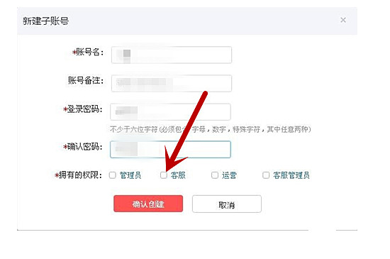 在弹出的对话框中,输入的账号名和密码,选择拥有的权限,点击“确认创建”就开通成功了。